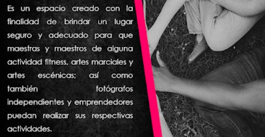 Es un espacio creado con la finalidad de brindar un lugar seguro y adecuado para que maestras y maestros de alguna actividad, fitness, artes marciales y artes escénicas; así como también fotógrafos y emprendedores puedan realizar sus actividades