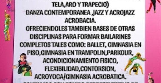 Academia de danza que forma bailarines completos ya que en cada clase que tomen ya sea aéreo o contemporáneo se les dan las bases de otras disciplinas como: gimnasia, acroyoga,contorsion, bases del ballet clásico , gimnasia acrobatica , gimnasia en trampolin, acondicionamiento fisico & jazz.